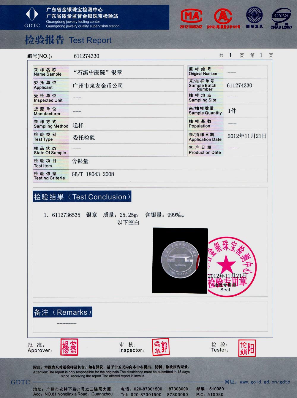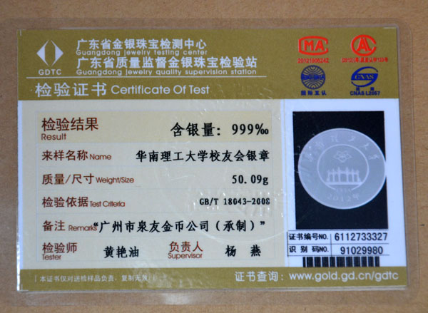 廣東省質監純金銀紀念章鑒定報告