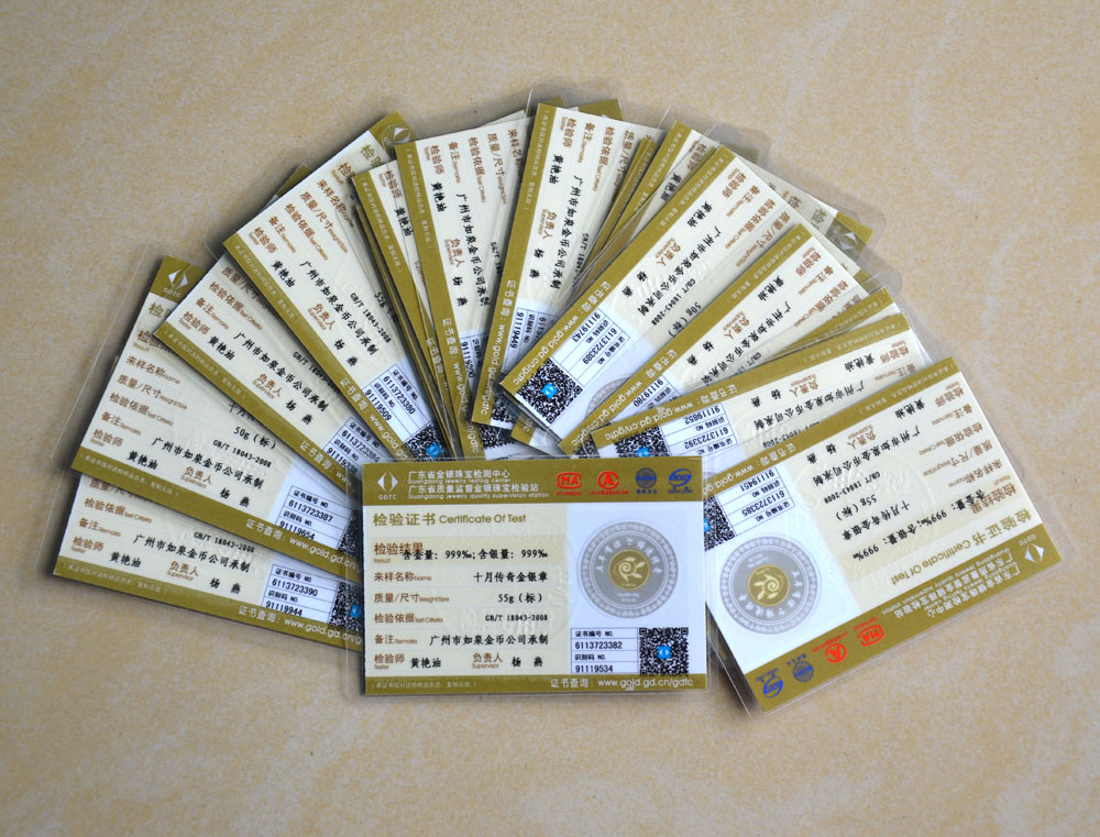廣東省質監局黃金千足金純金鑒定證書