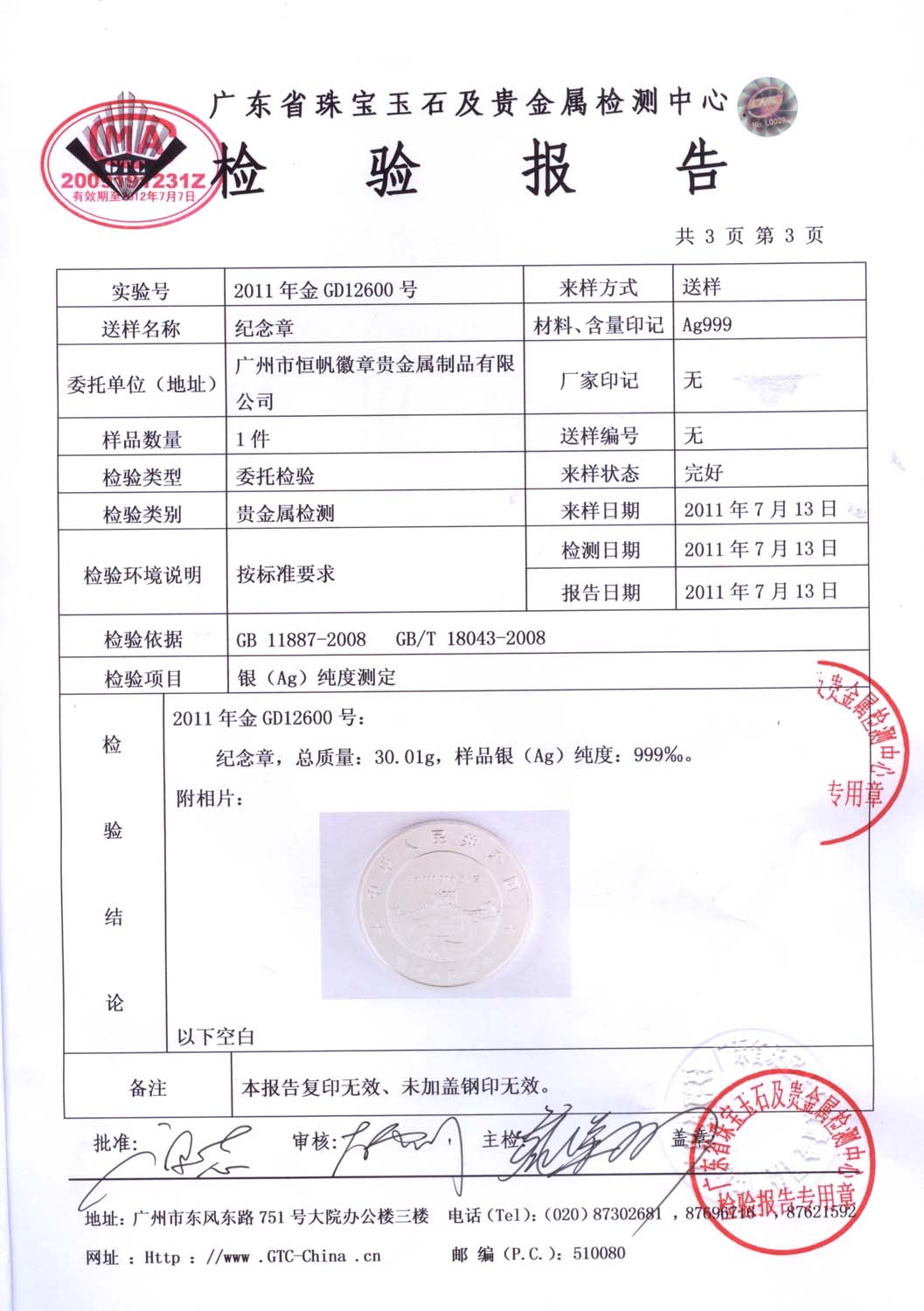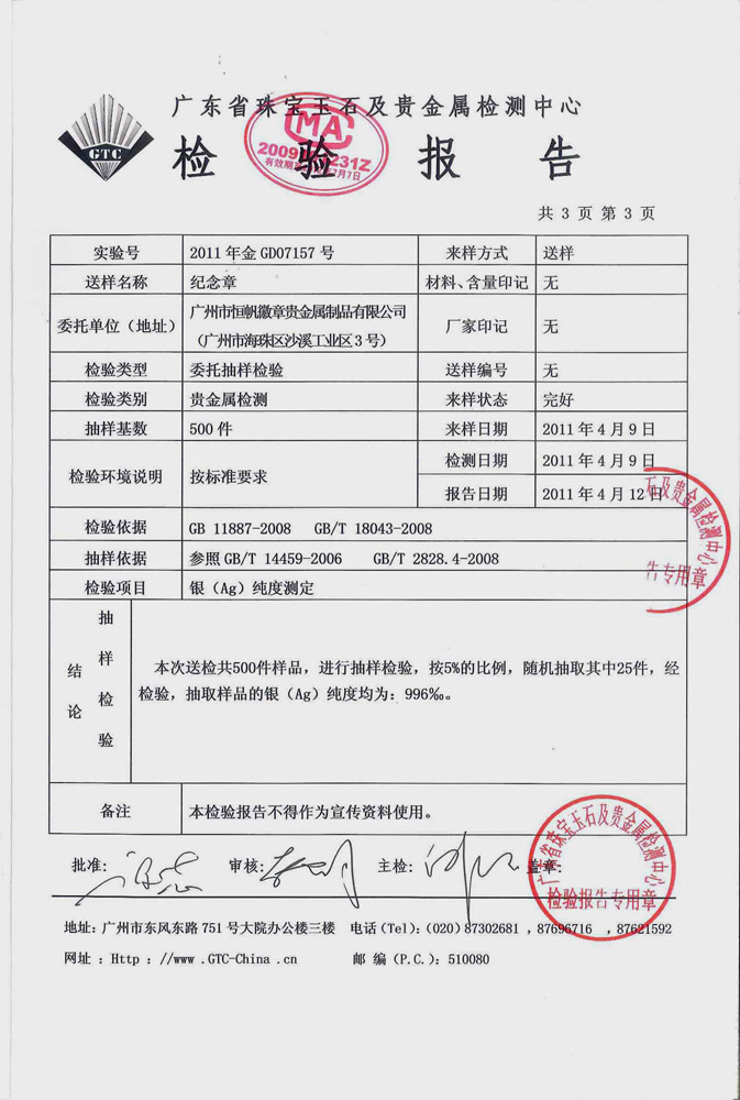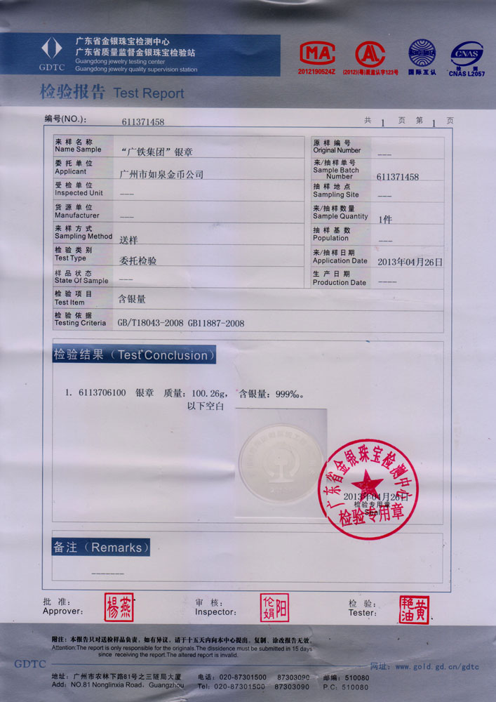 • 中國鐵路通信信號(hào)公司銀幣定做檢測(cè)報(bào)告