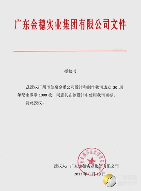 2013年6月:廣東金穗公司成立20周年純銀紀念章定做