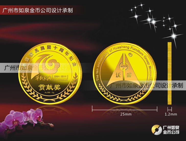 中山華盛公司年會表彰獎勵在崗三年、服務滿五年、十年優秀員工貢獻獎定做純金金牌、定制純金獎牌 制作千足金金幣
