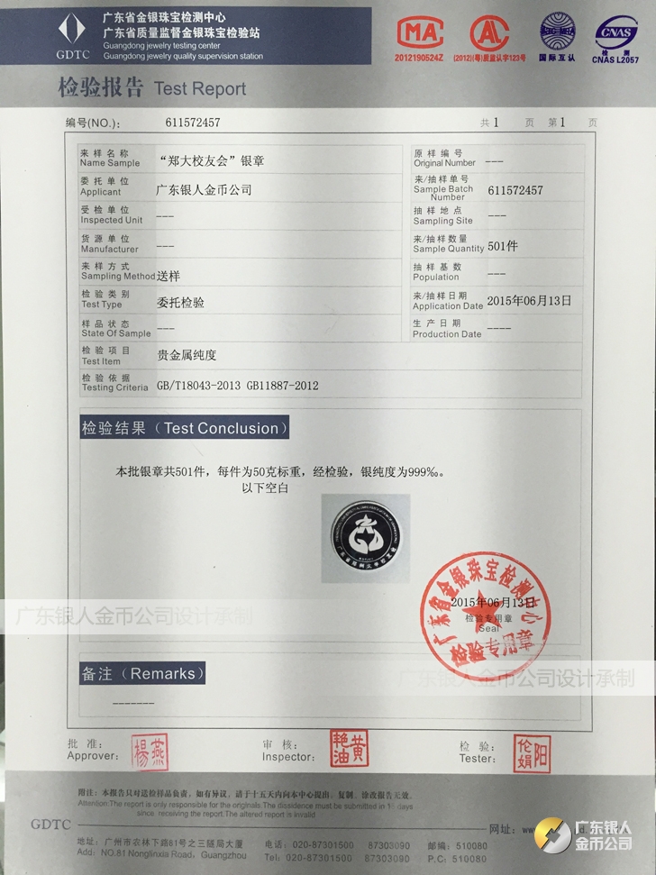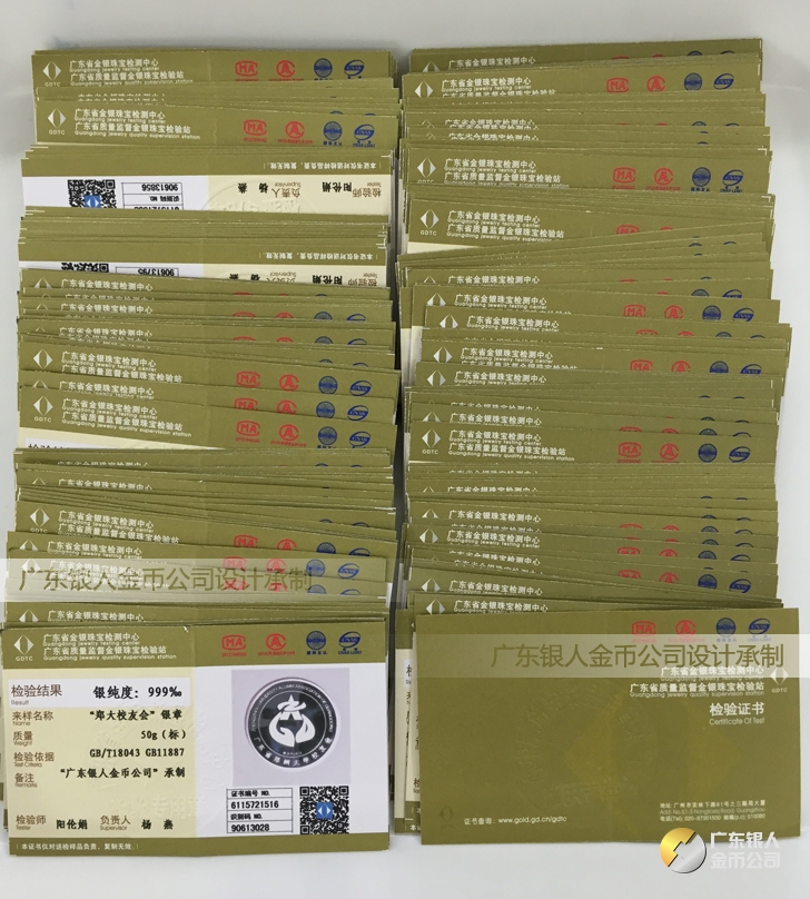 廣東銀人金幣公司承接客戶(hù)個(gè)性化定制的金銀幣、金銀章、金銀條、金銀牌、金銀盤(pán)均由國(guó)家質(zhì)監(jiān)部門(mén)、嚴(yán)格檢測(cè)、權(quán)威鑒定: