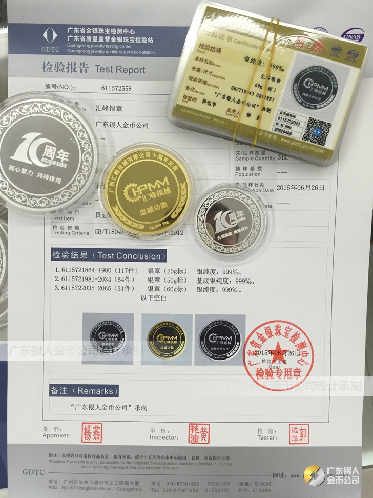 廣東銀人金幣公司承接客戶個性化定制的金銀幣、金銀章、金銀條、金銀牌、金銀盤均由國家質監(jiān)部門、嚴格檢測、權威鑒定: 出具————國家質檢、檢測報告。
