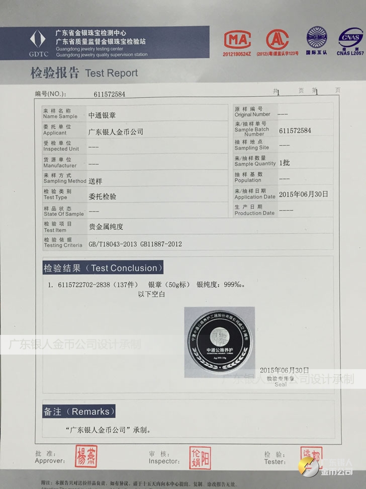 廣東銀人金幣公司承接客戶(hù)個(gè)性化定制的金銀幣、金銀章、金銀條、金銀牌、金銀盤(pán)均由國(guó)家質(zhì)監(jiān)部門(mén)、嚴(yán)格檢測(cè)、權(quán)威鑒定:
