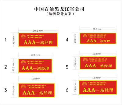 中國石油黑龍江省哈爾濱市銷售分公司——公司下轄各地加油站工作人員胸牌、加油員胸牌、站經理奧瑪板胸牌、復核員工號牌、計量員工牌、油站營業員奧瑪板工牌的設計與制作。