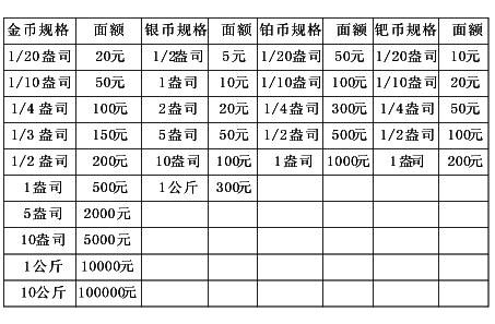 中國人民銀行自2000年發(fā)行 “千年紀(jì)念”金銀幣開始,規(guī)范統(tǒng)一了貴金屬紀(jì)念幣各種材質(zhì)的規(guī)格品種與其標(biāo)注面額的標(biāo)準(zhǔn)。具體見下表: