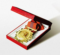 該獎?wù)轮睆?厘米,用99.9%純金鑄造,重量515克,配有綬帶,可懸掛佩于胸前。獎?wù)轮黧w圖案由五星、長城、橄欖枝和光芒線.成:獎?wù)轮行牡奈逍谴碇腥A人民共和國;長城既象征著中華民族堅強不屈的精神,又象征著共和國堅不可摧的國防;橄欖枝則表明我國研制“兩彈一星”的目的是為了維護世界和平。獎?wù)屡溆薪瓭擅裢居H筆簽章的證書,并用紅木盒包裝。其規(guī)格、材質(zhì)、圖案和證書等方面,突出了這是共和國最高等級獎?wù)碌奶卣鳌T摢務(wù)略O(shè)計端莊、章型宏偉、制作精良、包裝華麗,堪稱我國歷史上最為精美絕倫的勛章,更由于數(shù)量僅有23枚,極為珍罕。